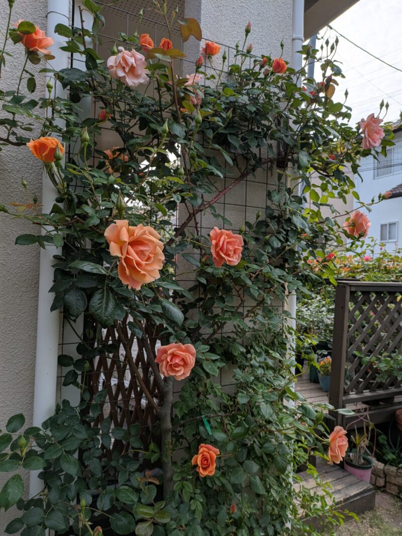 5月連休の薔薇の様子です。「ロイヤルサンセット」は次々に花を咲かせています。「キング」は開花が遅いようでまだつぼみも来ていません。